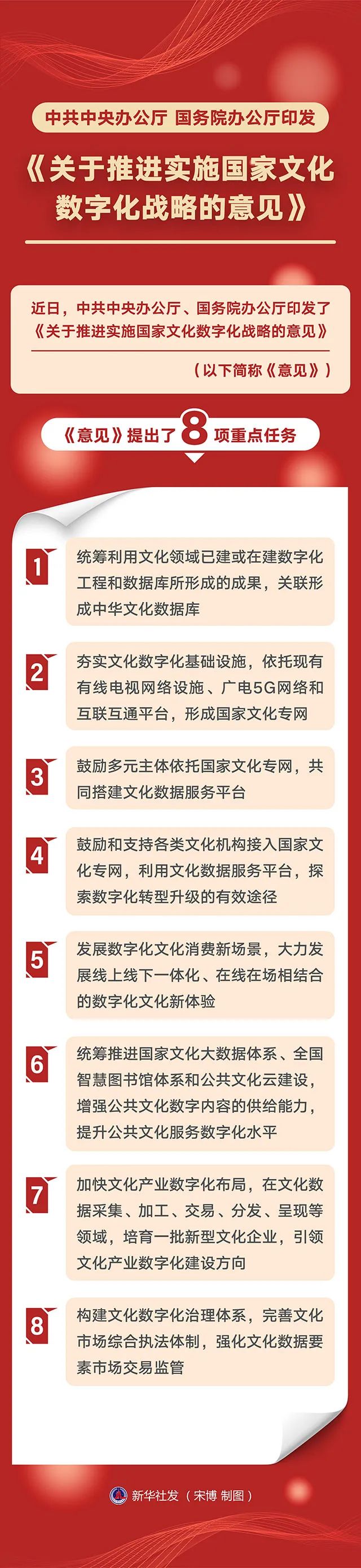近日,中共中央辦公廳、國務(wù)院辦公廳印發(fā)了《關(guān)于推進(jìn)實施國家文化數(shù)字化戰(zhàn)略的意見》。該意見聚焦戰(zhàn)略目標(biāo)和戰(zhàn)略重點,對戰(zhàn)略路徑和步驟作出重點部署,是推動實施國家文化數(shù)字化戰(zhàn)略、建設(shè)國家文化大數(shù)據(jù)體系的框架性、指導(dǎo)性文件。