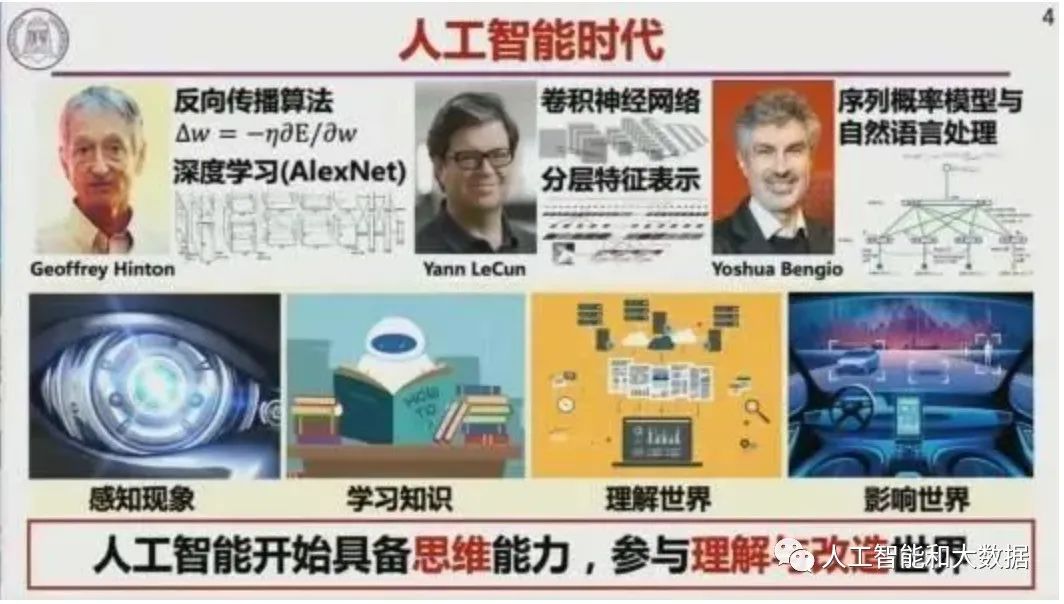 人工智能時代出現(xiàn)了三位深度學(xué)習(xí)的奠基人,也是2019年的圖靈獎獲得者。第一是Geoffrey Hinton(杰弗里?辛頓),反向傳播算法的代表人物;第二是Yann LeCun(楊立昆),卷積神經(jīng)網(wǎng)絡(luò)的代表人物;第三是Yoshua Bengio(約書亞?本吉奧),序列概率模型的代表人物。