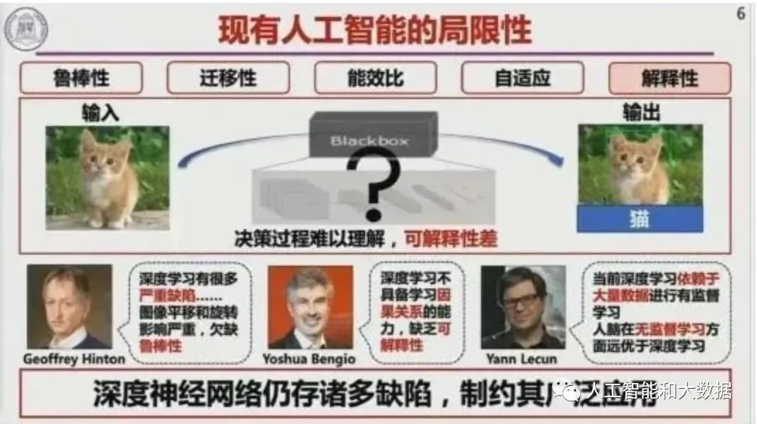 同時,我們更應(yīng)看到人工智能的局限性:其一,自動駕駛領(lǐng)域中人工智能的相關(guān)應(yīng)用,已經(jīng)凸顯了其在魯棒性、遷移性及能效比等方面的問題;其二,在醫(yī)療領(lǐng)域中的應(yīng)用凸顯了人工智能算法自適應(yīng)能力的局限,清華大學(xué)跟301醫(yī)院合作,用20萬條男性50歲的腦卒數(shù)據(jù)做訓(xùn)練,但在做預(yù)測時發(fā)現(xiàn)對女性腦卒疾病的預(yù)測準(zhǔn)確度并不高;其三,人工智能可解決一定的問題,但其工作原理還沒有明確的可解釋性。
