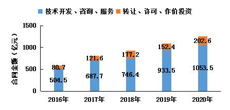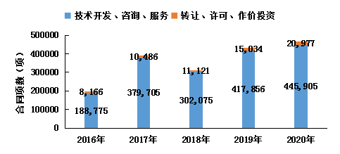 (二)多種方式轉(zhuǎn)化的科技成果均呈上升趨勢(shì)。以轉(zhuǎn)讓、許可、作價(jià)投資方式轉(zhuǎn)化科技成果的合同項(xiàng)數(shù)、合同金額、當(dāng)年到賬金額均明顯增長(zhǎng)。2020年,3554家高校院所以轉(zhuǎn)讓、許可、作價(jià)投資方式轉(zhuǎn)化科技成果的合同項(xiàng)數(shù)為20,977項(xiàng),合同總金額為202.6億元。轉(zhuǎn)化合同金額超過1億元的高校院所數(shù)量超過40家。技術(shù)開發(fā)、咨詢、服務(wù)合同項(xiàng)數(shù)、合同金額略有增長(zhǎng),合同項(xiàng)數(shù)為445905項(xiàng),合同金額為1053.5億元。技術(shù)開發(fā)、咨詢、服務(wù)合同金額超過10億元的高校院所共12家。