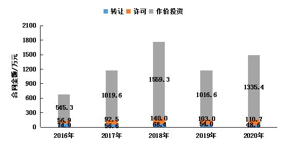 圖4 以轉(zhuǎn)讓、許可、作價(jià)投資方式轉(zhuǎn)化科技成果平均合同金額情況