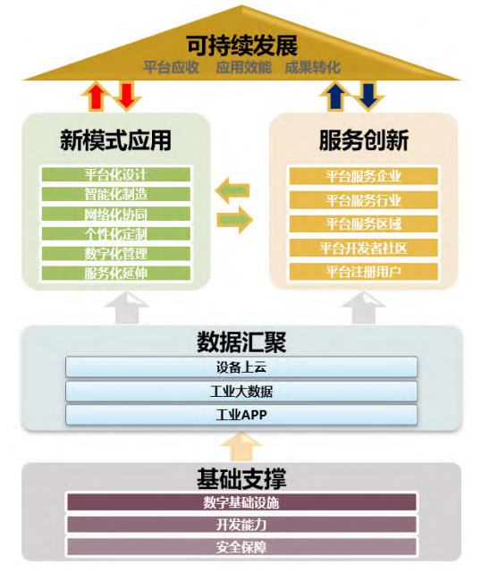 當(dāng)前我國(guó)工業(yè)互聯(lián)網(wǎng)發(fā)展步入快車(chē)道,如何進(jìn)一步發(fā)揮工業(yè)互聯(lián)網(wǎng)對(duì)制造業(yè)轉(zhuǎn)型升級(jí)的引擎作用是產(chǎn)業(yè)界面臨的新課題。本文主要從平臺(tái)對(duì)于數(shù)字化轉(zhuǎn)型的基礎(chǔ)支撐、數(shù)據(jù)匯聚、新模式應(yīng)用、服務(wù)創(chuàng)新、可持續(xù)發(fā)展等五個(gè)方面展開(kāi)如圖1所示?;A(chǔ)支撐作為基本能力為數(shù)字化轉(zhuǎn)型提供開(kāi)發(fā)、技術(shù)、安全底座,數(shù)據(jù)匯聚能力體現(xiàn)平臺(tái)采集數(shù)據(jù)、交換數(shù)據(jù)、分析數(shù)據(jù)、應(yīng)用數(shù)據(jù)水平,衡量數(shù)據(jù)要素作用和價(jià)值,平臺(tái)通過(guò)基礎(chǔ)支撐和數(shù)據(jù)匯聚迭代形成多樣化新模式新應(yīng)用并拓展服務(wù)創(chuàng)新能力,有效驅(qū)動(dòng)制造業(yè)數(shù)字化轉(zhuǎn)型和高質(zhì)量發(fā)展,最終在雙向循環(huán)下實(shí)現(xiàn)長(zhǎng)期可持續(xù)發(fā)展。