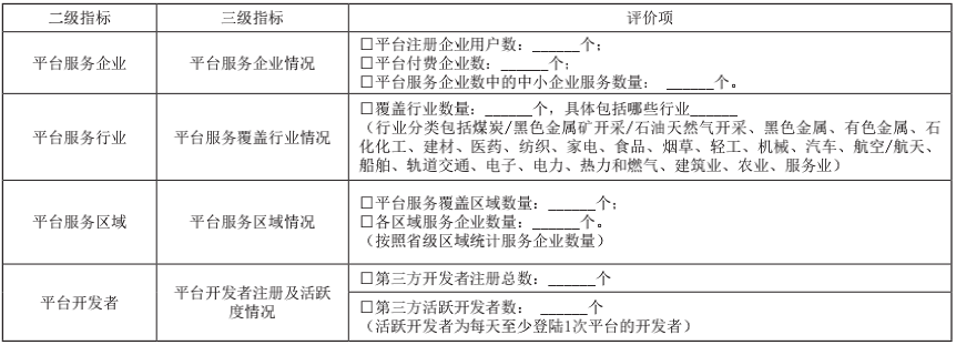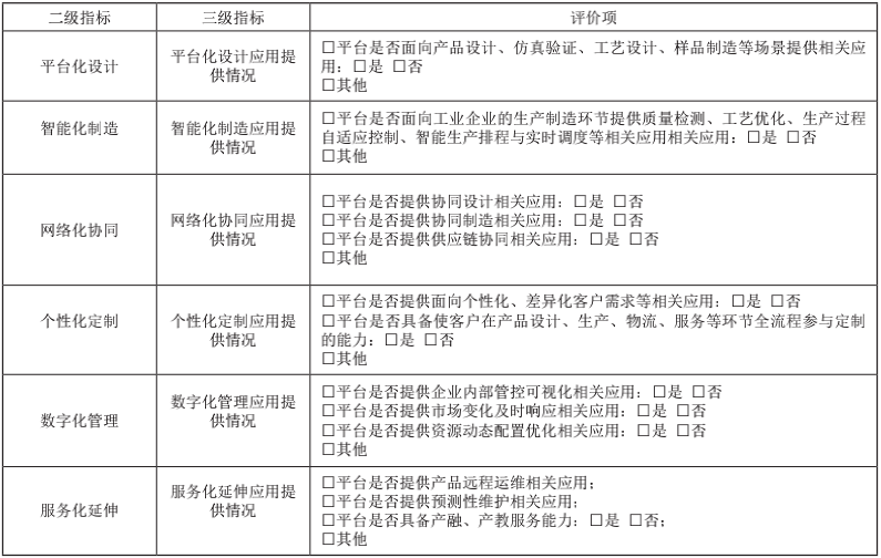 新模式應(yīng)用能力主要包括平臺(tái)化設(shè)計(jì)、智能化制造、網(wǎng)絡(luò)化協(xié)同、個(gè)性化定制、服務(wù)化延伸、數(shù)字化管理六個(gè)方面,用于評(píng)價(jià)工業(yè)互聯(lián)網(wǎng)平臺(tái)賦能制造業(yè)數(shù)字化轉(zhuǎn)型新模式應(yīng)用的供給能力,具體評(píng)價(jià)指標(biāo)和評(píng)價(jià)項(xiàng)表3。