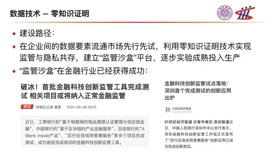 在企業(yè)間的數(shù)據(jù)要素流通市場先行先試,利用零知識證明技術(shù)實(shí)現(xiàn)監(jiān)管與隱私共存,建立“監(jiān)管沙盒”平臺,逐步實(shí)驗(yàn)成熟投入生產(chǎn)。