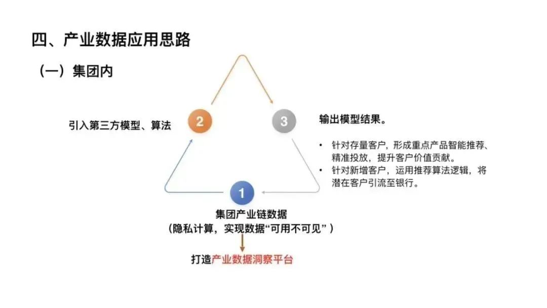 2. 利用隱私計(jì)算技術(shù),“數(shù)據(jù)可用不可見”,在多企業(yè)集團(tuán)內(nèi)部先行形成數(shù)據(jù)流動平臺;