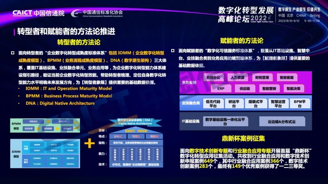 栗蔚表示在2021年中國信通院發(fā)布的“企業(yè)數(shù)字化轉(zhuǎn)型發(fā)展雙曲線”受到了業(yè)界廣泛關(guān)注,經(jīng)過一年的宏觀調(diào)查趨勢和微觀探究過程,中國信通院將企業(yè)數(shù)字化轉(zhuǎn)型發(fā)展雙曲線升級為雙象限。雙象限分為轉(zhuǎn)型者象限和賦能者象限兩大部分,轉(zhuǎn)型者象限從企業(yè)轉(zhuǎn)型能力和轉(zhuǎn)型價值維度進(jìn)行量化評價,通過IOMM企業(yè)數(shù)字化轉(zhuǎn)型成熟度模型、BPMM業(yè)務(wù)流程成熟度模型、DNA數(shù)字原生架構(gòu)進(jìn)行研究和評估觀察;賦能者象限從技術(shù)服務(wù)能力和行業(yè)賦能價值維度進(jìn)行量化評價,以數(shù)字基礎(chǔ)設(shè)施、智慧中臺、業(yè)務(wù)應(yīng)用等解決方案產(chǎn)品的情況作為基礎(chǔ)數(shù)據(jù)。