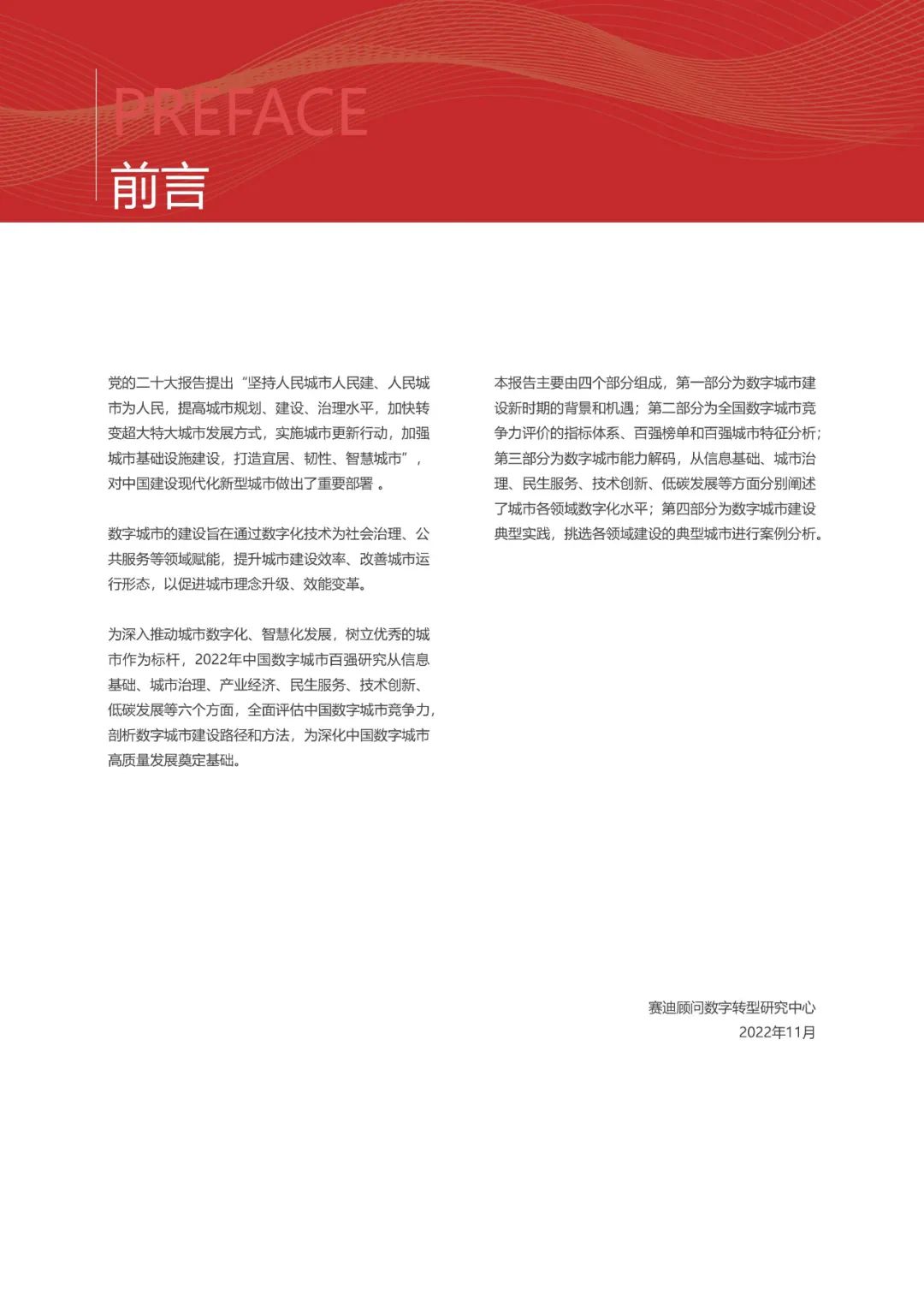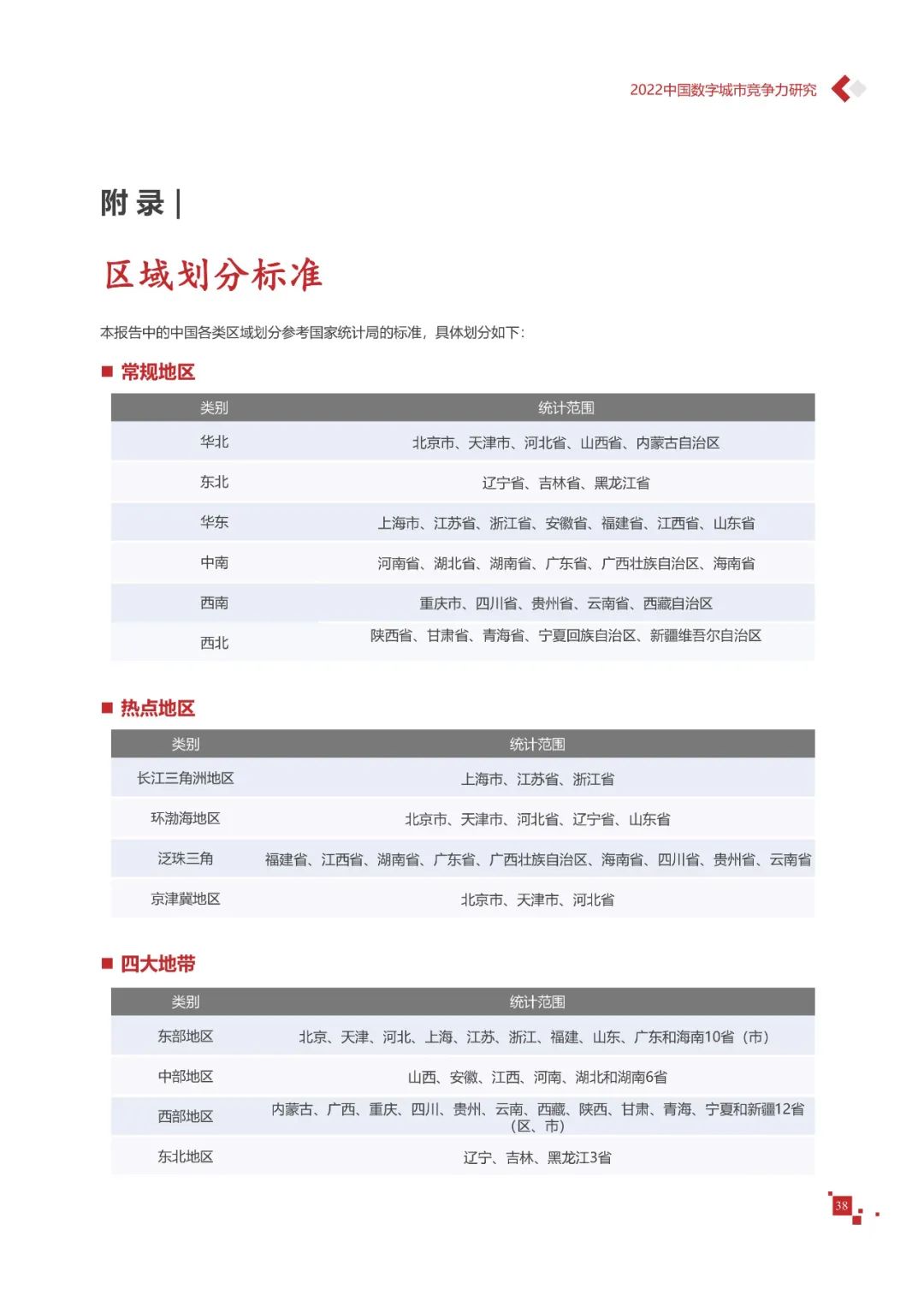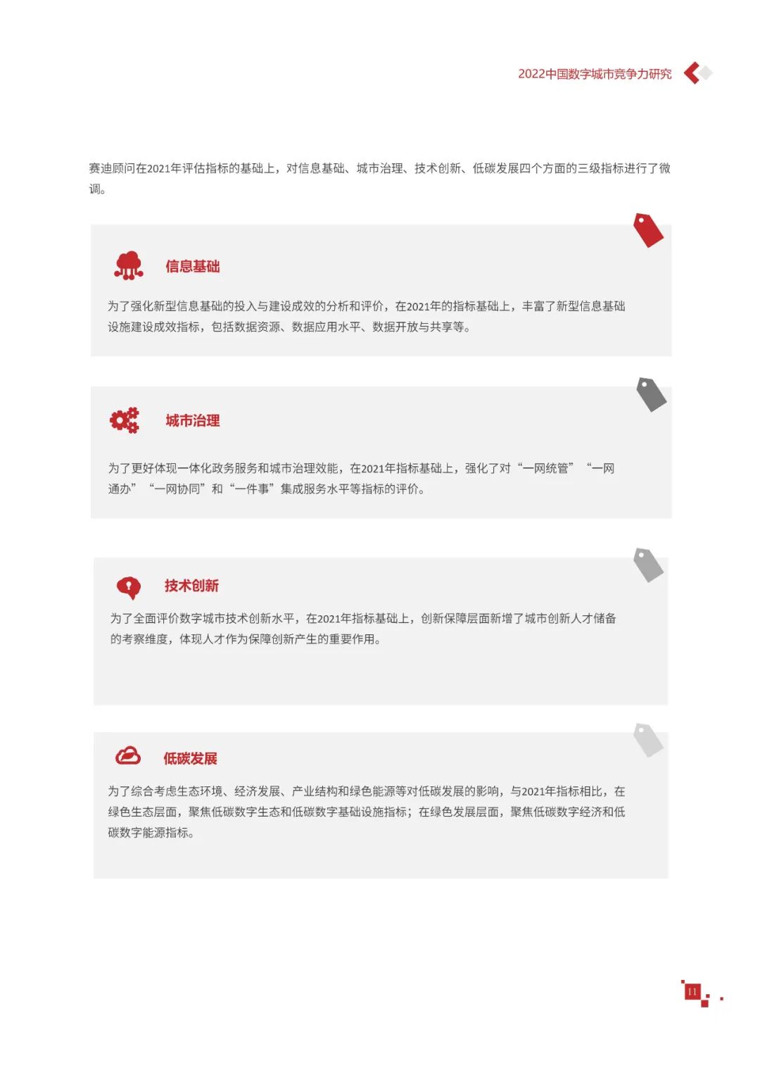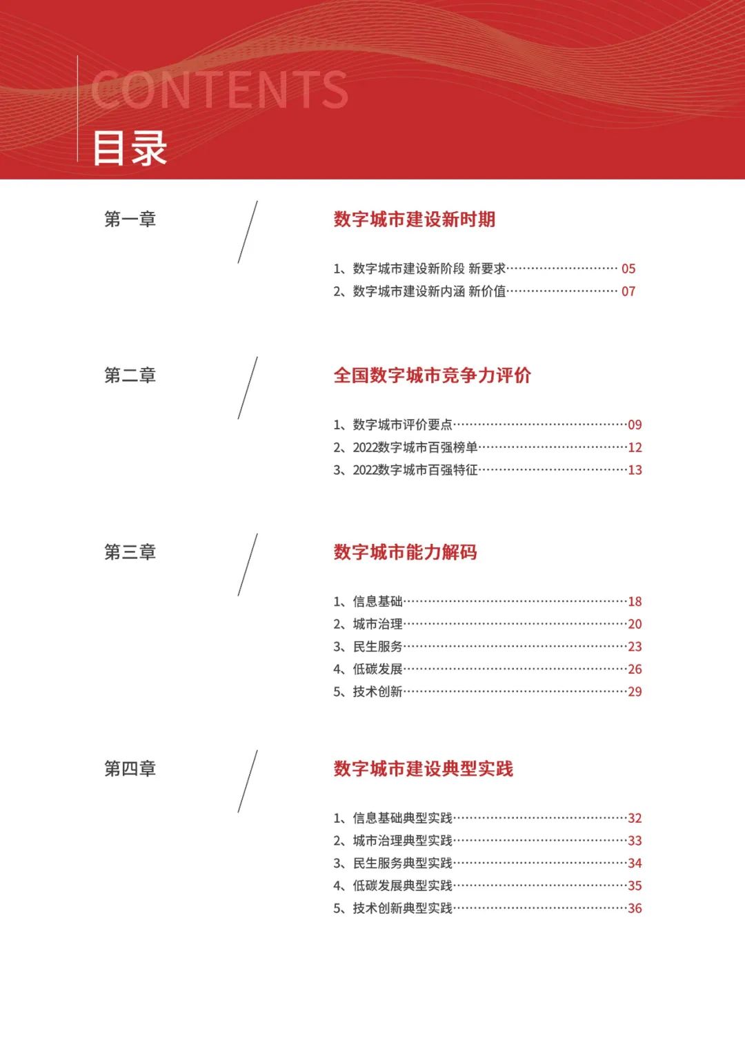 報告主要由四個部分組成,第一部分為數(shù)字城市建設新時期的背景和機遇;第二部分為全國數(shù)字城市競爭力評價的指標體系、百強榜單和百強城市特征分析;第三部分為數(shù)字城市能力解碼,從信息基礎、城市治理、民生服務、技術(shù)創(chuàng)新、低碳發(fā)展等方面分別闡述了城市各領(lǐng)域數(shù)字化水平;第四部分為數(shù)字城市建設典型實踐,挑選各領(lǐng)域建設的典型城市進行案例分析。