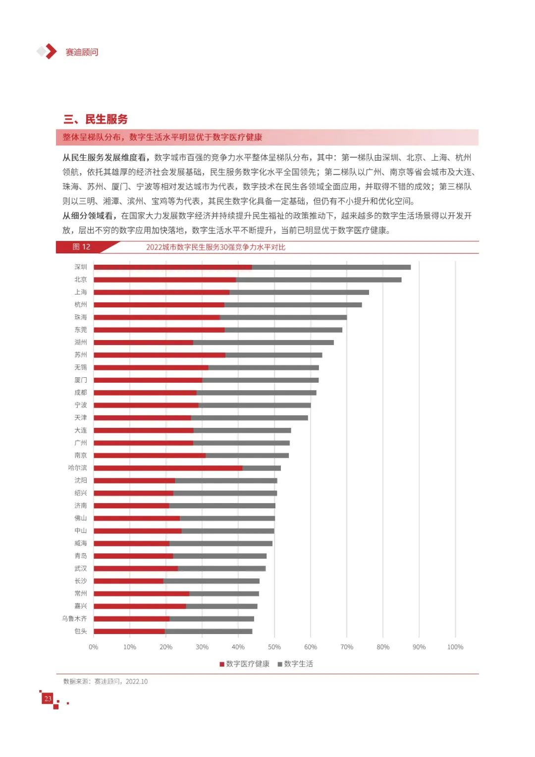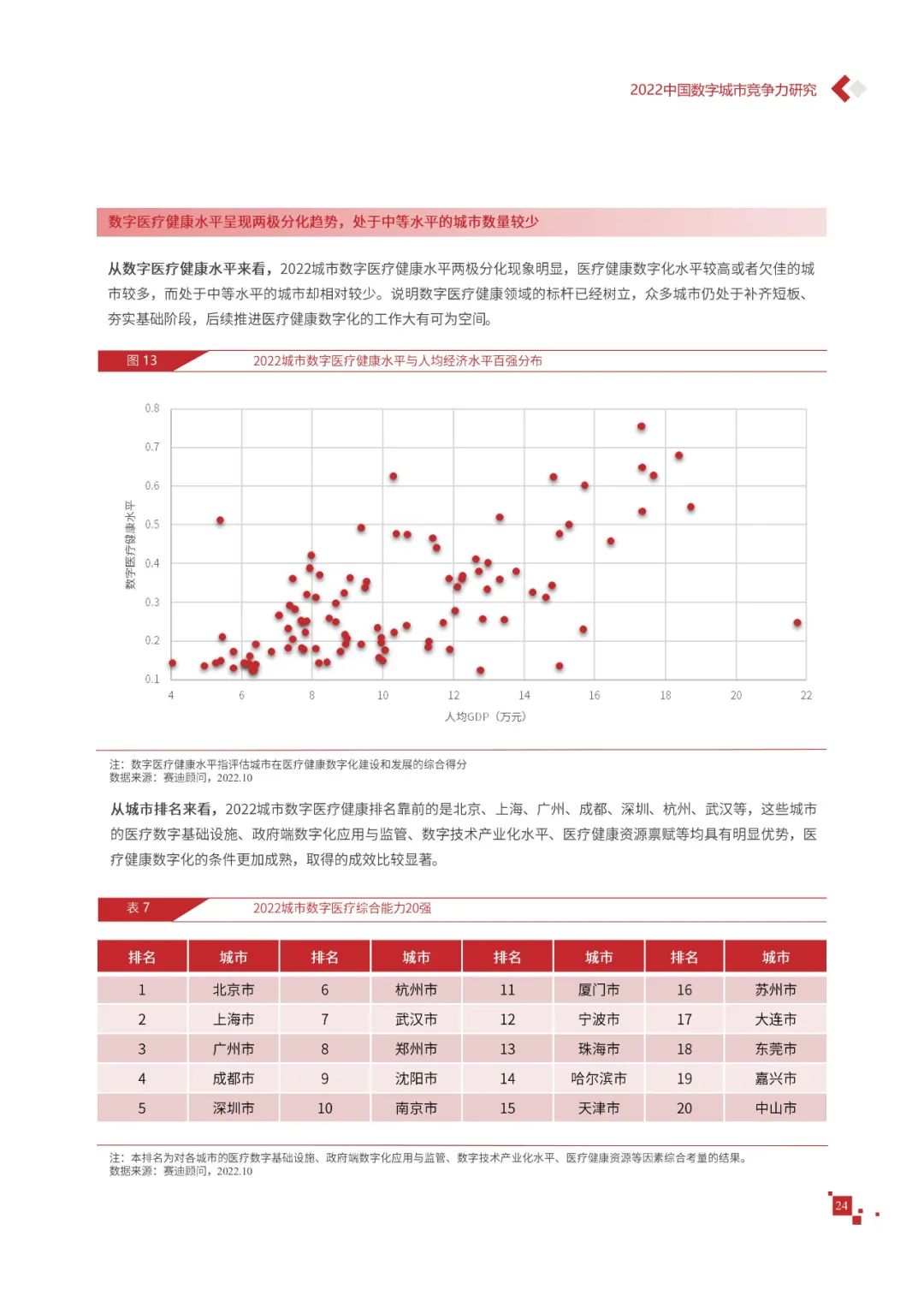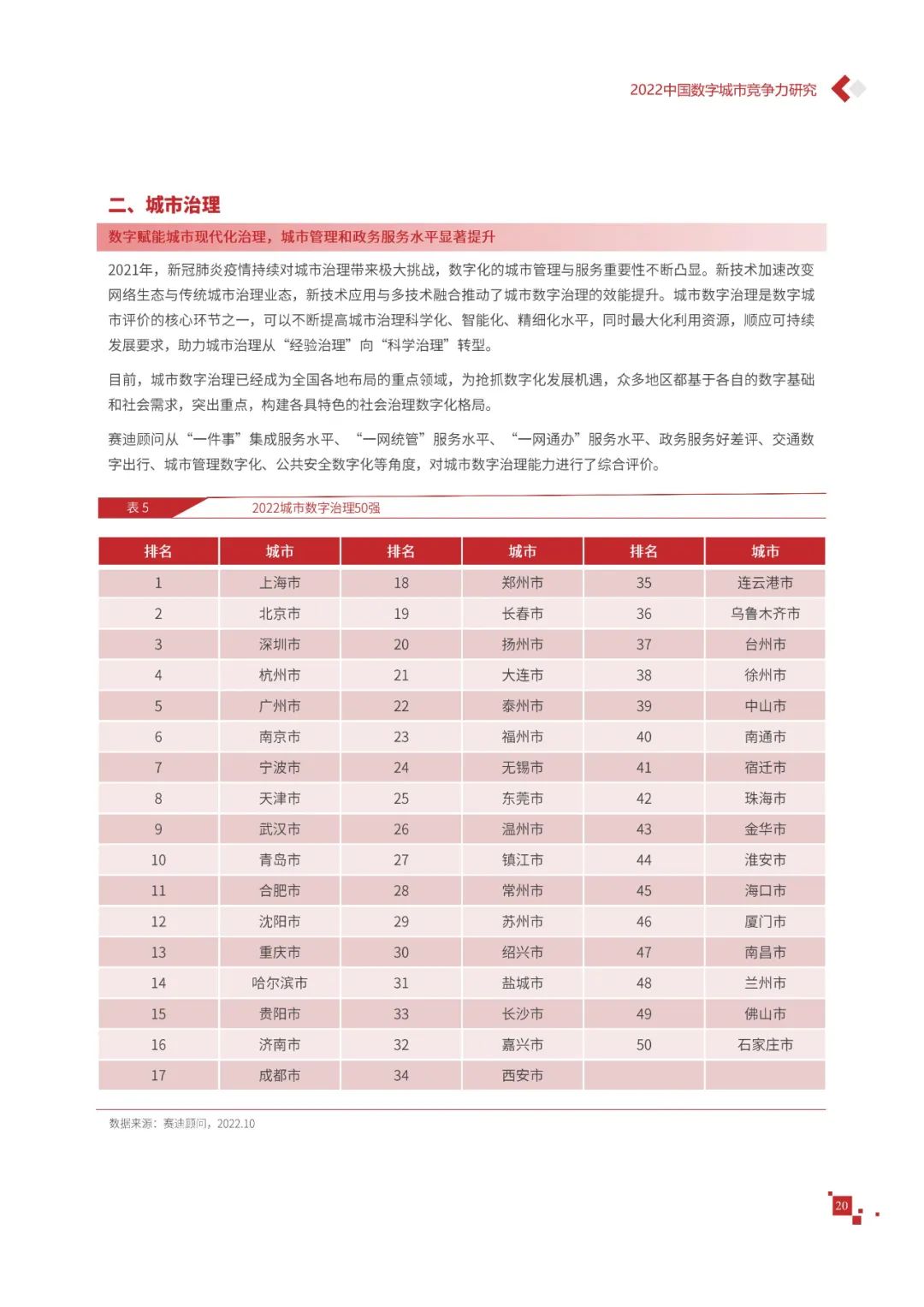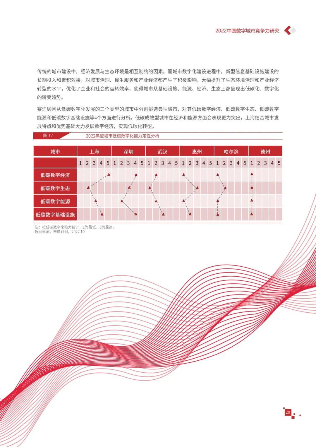 報告主要由四個部分組成,第一部分為數(shù)字城市建設新時期的背景和機遇;第二部分為全國數(shù)字城市競爭力評價的指標體系、百強榜單和百強城市特征分析;第三部分為數(shù)字城市能力解碼,從信息基礎、城市治理、民生服務、技術(shù)創(chuàng)新、低碳發(fā)展等方面分別闡述了城市各領(lǐng)域數(shù)字化水平;第四部分為數(shù)字城市建設典型實踐,挑選各領(lǐng)域建設的典型城市進行案例分析。