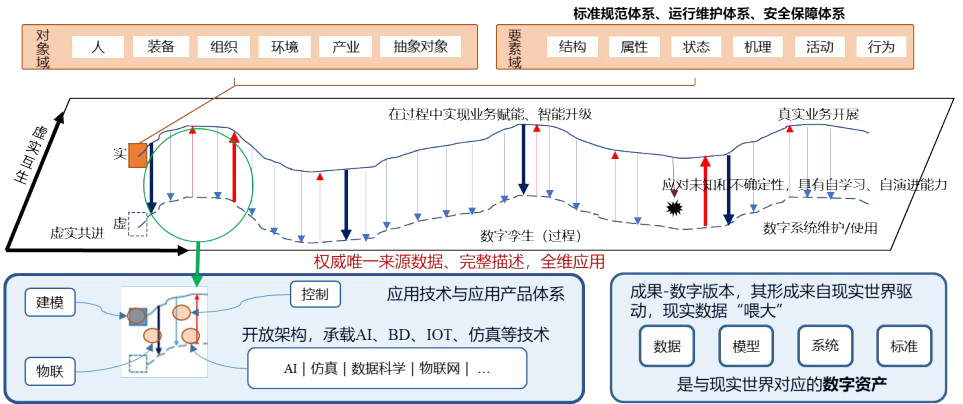 如圖,從對象域看,人、裝備、組織、環(huán)境、產業(yè)或者抽象對象均可作為數字孿生的對象;從要素域看,數字孿生體的屬性包括結構、屬性、狀態(tài)、機理、活動、行為及其聯系等;從作用域看,物理實體通過建模和物聯數據驅動數字孿生體,數字孿生體則依托AI、大數據、仿真等技術,實現對物理實體的反向控制;從成果形式來看,數字孿生體在伴隨現實世界運行過程中產生的數據、模型、系統和標準構成與現實世界對應的數字資產,數字孿生體在物理實體真實數據的“喂養(yǎng)”下,成長為自循環(huán)、自適應、自學習、自演進的“數字生命體”。