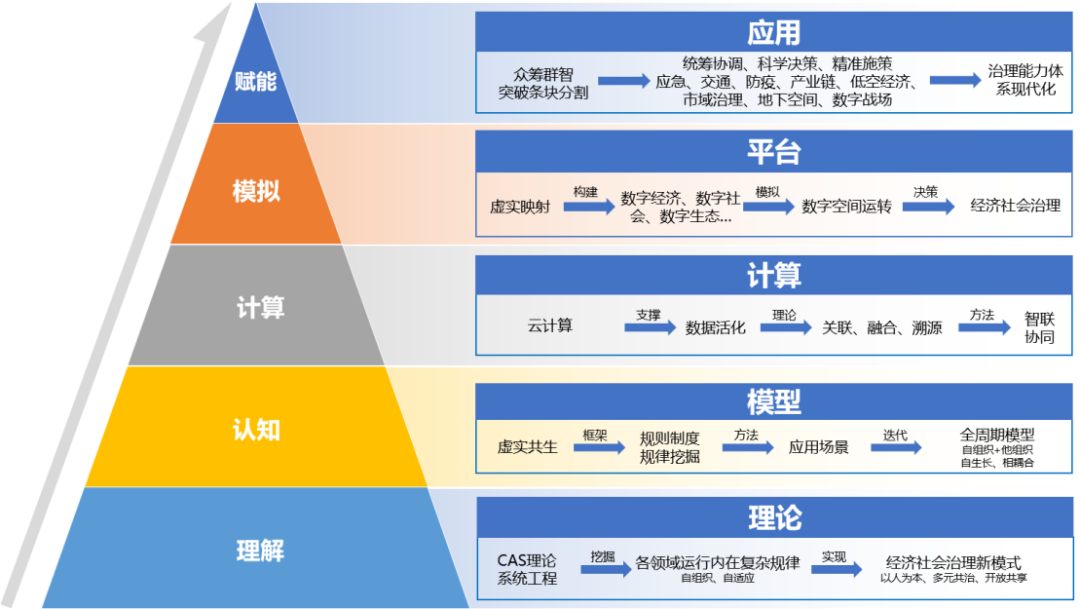 如前文所述,針對數字治理復雜系統的基本特征,我們可以充分利用數字孿生“由實生虛、以虛控實、虛實互動、共生演進”的特點優(yōu)勢,沿著“理解、認知、計算、模擬、賦能”的鏈條,用數字孿生驅動數字治理,為數字治理提供基于數字孿生的整體解決方案。