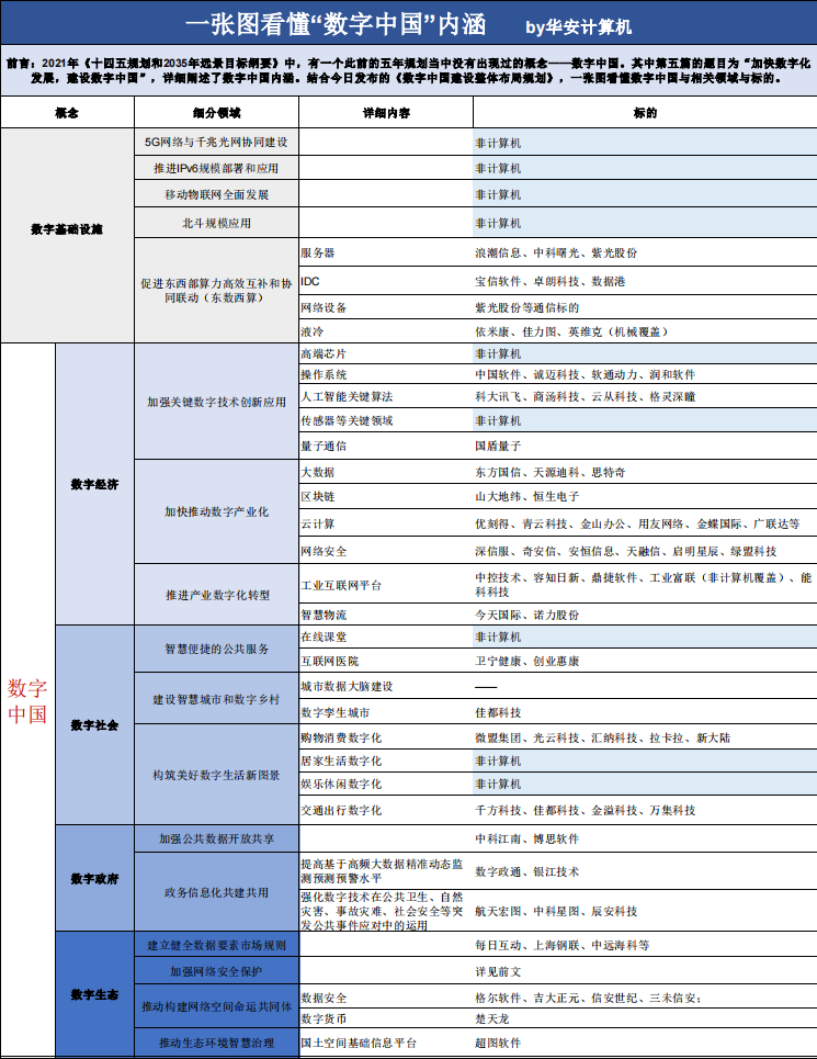 《規(guī)劃》提出,到 2025 年,基本形成 橫向打通、縱向貫通、協(xié)調(diào)有力的一體化推進(jìn)格局,數(shù)字中國建設(shè) 取得重要進(jìn)展;到 2035 年,數(shù)字化發(fā)展水平進(jìn)入世界前列,數(shù)字中國建設(shè)取得重大成就。具體建設(shè)內(nèi)容從新型基數(shù)設(shè)施建設(shè)、到關(guān)鍵技術(shù)推進(jìn),再到政務(wù)、工業(yè)、教育等多行業(yè)信息化建設(shè),利好計算機(jī)多個細(xì)分板塊發(fā)展。