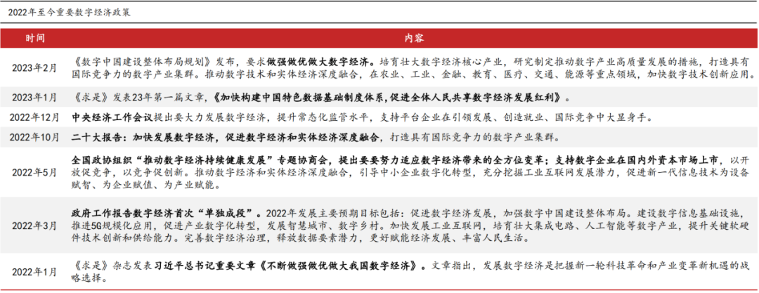 今年2月發(fā)布的《數(shù)字中國建設(shè)整體布局規(guī)劃》為數(shù)字中國建設(shè)提供了頂層設(shè)計指導(dǎo),數(shù)字經(jīng)濟(jì)納入官員政績考核體系,標(biāo)志著“數(shù)字中國”建設(shè)按下加速鍵,對數(shù)字經(jīng)濟(jì)的發(fā)展具有強(qiáng)推動力;各地將大力布局?jǐn)?shù)字基建和爭奪數(shù)字產(chǎn)業(yè),新一輪數(shù)字經(jīng)濟(jì)產(chǎn)業(yè)的發(fā)展機(jī)遇即將來臨。