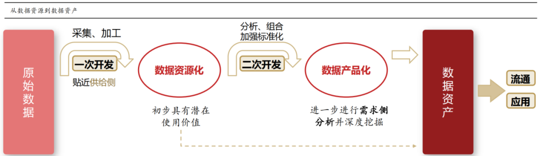 我們認(rèn)為將原始數(shù)據(jù)轉(zhuǎn)化為數(shù)據(jù)資產(chǎn)主要需要經(jīng)過數(shù)據(jù)資源化、數(shù)據(jù)產(chǎn)品化兩個階段。