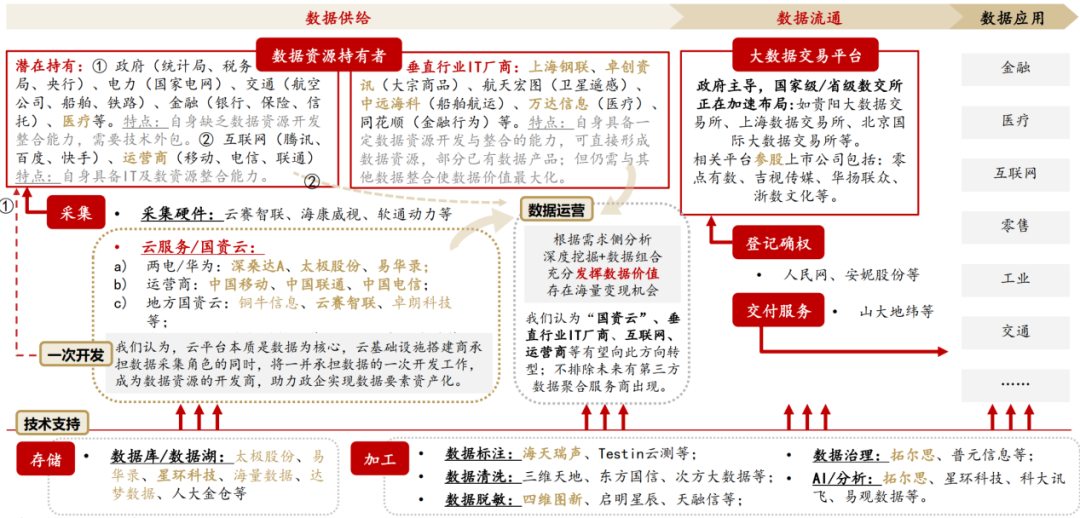 其三:我們認(rèn)為,“國資云”建設(shè)方有望承擔(dān)起國有數(shù)據(jù)資源“一級開發(fā)商”的角色,后續(xù)憑借在數(shù)據(jù)供給側(cè)的稟賦,有望發(fā)展成助力政府/央國企進(jìn)行數(shù)據(jù)資產(chǎn)開發(fā)+數(shù)據(jù)資產(chǎn)運營的一體化平臺
