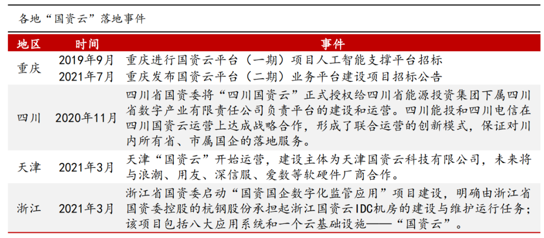 國資云是指由各地國資委牽頭投資、設(shè)立、運營,通過建設(shè)高安全防護(hù)水平的數(shù)據(jù)安全基礎(chǔ)設(shè)施底座,并搭建以匯聚國有企業(yè)數(shù)據(jù)為核心的數(shù)據(jù)治理體系及云平臺,包括IaaS、PaaS和SaaS。