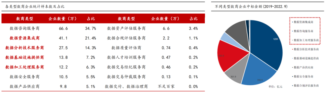 數(shù)據(jù)資源集成商41萬家,占比約21.4%;數(shù)據(jù)分析技術(shù)服務(wù)商27.5萬家,占比約14.3%;數(shù)據(jù)基礎(chǔ)設(shè)施提供商13.8萬家,占比為7.17%;數(shù)據(jù)加工處理服務(wù)商12.2萬家,占比為6.33%。