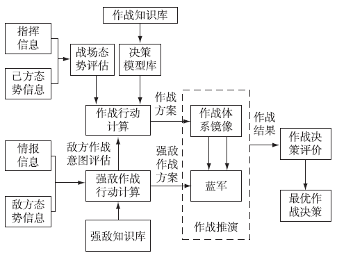 作戰(zhàn)人員的心理和智能因素是決定戰(zhàn)爭成敗的重要因素,決策指揮的效率和質(zhì)量是體系級訓(xùn)練中重要的考核指標。指揮員除了能對敵情、我情進行基本的判斷,對指揮流程、作戰(zhàn)時機要有精準的掌握,對裝備要能熟練地運用,最重要的是能夠?qū)嬰s、不確定和不完整的戰(zhàn)場信息進行分析,并在這種不透明的戰(zhàn)場態(tài)勢下做出有利的決策。而智能決策是將作戰(zhàn)規(guī)則、裝備運用編成等指揮員的專業(yè)知識存入知識庫,在透明的藍方戰(zhàn)場態(tài)勢和戰(zhàn)場環(huán)境下,通過計算試驗對作戰(zhàn)過程進行計算,獲得作戰(zhàn)方案,然后調(diào)動整個數(shù)字孿生靶場中各種實體進行推演,獲取在不同作戰(zhàn)態(tài)勢下的最優(yōu)決策,這既可以用于對指揮員進行輔助決策,又可以用于對作戰(zhàn)指揮員的最終作戰(zhàn)指揮方案進行評估,從而提高指揮員的決策能力。智能決策過程如圖2所示。