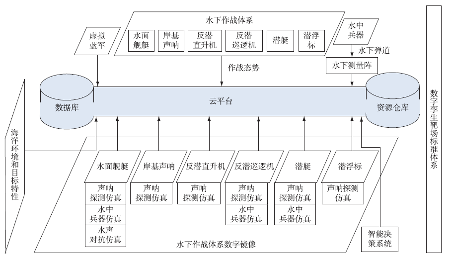 水下攻防作戰(zhàn)空間廣泛,作戰(zhàn)要素復(fù)雜,作戰(zhàn)結(jié)構(gòu)多維,在訓(xùn)練過程中存在強敵對手引入不夠,體系運用戰(zhàn)法不足等問題。通過整合作戰(zhàn)資源和靶場仿真、測控等資源,形成完整的水下攻防作戰(zhàn)體系的數(shù)字鏡像,可用于體系級試驗和實兵對抗訓(xùn)練,評估裝備體系效能和探索創(chuàng)新水下攻防研練模式。