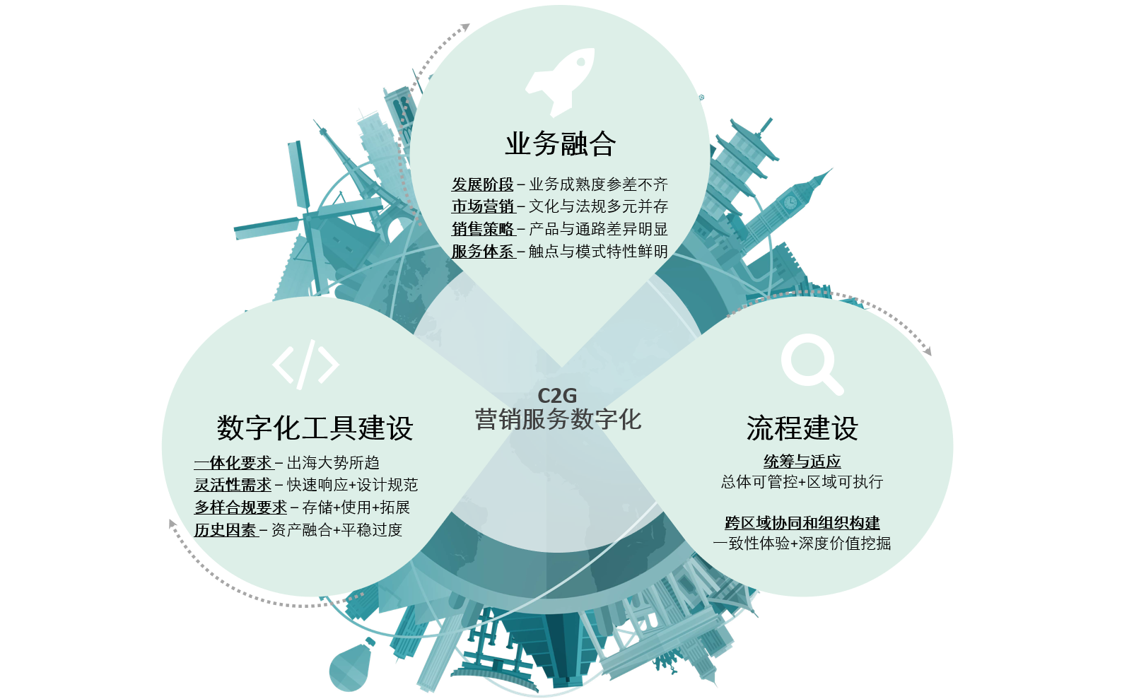 在企業(yè)全球化的進程中,中國企業(yè)需要通過對營銷服務(wù)能力的統(tǒng)籌管理并依托數(shù)字化手段實現(xiàn)全球領(lǐng)域的業(yè)務(wù)拓展和整合,充分融合國內(nèi)的成功經(jīng)驗和不同區(qū)域的文化、業(yè)務(wù)特性和競爭優(yōu)勢,以此成功進入海外市場并實現(xiàn)可持續(xù)發(fā)展和精益經(jīng)營。