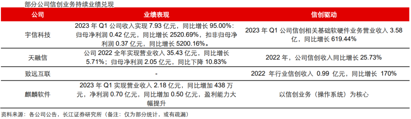 中長期產(chǎn)業(yè)趨勢確定,業(yè)績逐步兌現(xiàn)。目前信創(chuàng)產(chǎn)業(yè)的落地節(jié)奏呈現(xiàn)“2+8+N”的發(fā)展態(tài)勢。通過梳理產(chǎn)業(yè)內(nèi)相關(guān)上市公司業(yè)績發(fā)現(xiàn)依然有部分公司持續(xù)受益信創(chuàng)業(yè)務(wù)支撐,一方面行業(yè)信創(chuàng)仍在穩(wěn)步推進(jìn),另一方面 2022 年部分信創(chuàng)訂單交付遞延至 2023 年 Q1,支撐相關(guān)公司業(yè)績表現(xiàn)。