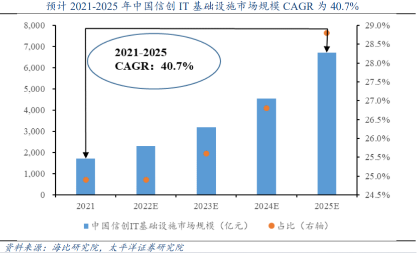 IT 基礎(chǔ)設(shè)施是信創(chuàng)事業(yè)的絕對(duì)核心,預(yù)計(jì)為信創(chuàng)產(chǎn)業(yè)體系中增速最快的環(huán)節(jié)。作為信創(chuàng)的核心、最底層與基礎(chǔ)的環(huán)節(jié),IT 基礎(chǔ)設(shè)施預(yù)計(jì)為整個(gè)國產(chǎn)替換浪潮中最先替換的部分。根據(jù)海比研究院數(shù)據(jù),2022 年中國信創(chuàng) IT 基礎(chǔ)設(shè)施規(guī)模為2299.1 億元,2021-2025 年復(fù)合增長率約為 40.7%,預(yù)計(jì)為信創(chuàng)增速最快的產(chǎn)品;在市場占比方面,IT 基礎(chǔ)設(shè)施占據(jù) 1/4 的市場份額,并且在持續(xù)增加,預(yù)計(jì)到 2025年占比將達(dá)到 28.8%。憑借 IT 基礎(chǔ)設(shè)施的核心地位及快速增長的良好勢頭,將為信創(chuàng)市場的發(fā)展奠定良好的開端。