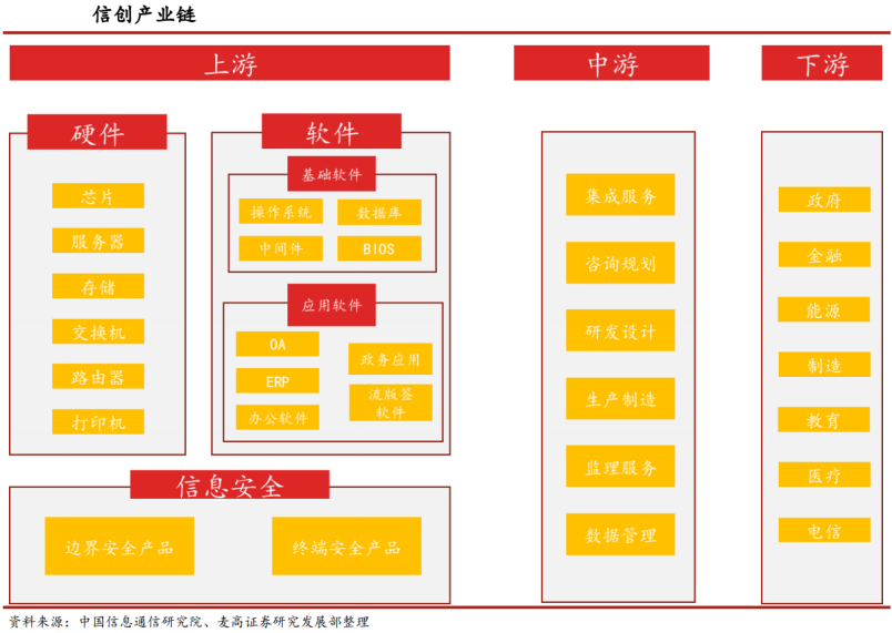 信創(chuàng)產(chǎn)業(yè)體系龐大,從產(chǎn)業(yè)鏈角度,主要由基礎(chǔ)硬件、基礎(chǔ)軟件、應(yīng)用軟件、信息安全四部分組成。其中基礎(chǔ)硬件主要包括芯片、服務(wù)器、存儲(chǔ)等;基礎(chǔ)軟件則主要包括操作系統(tǒng)、數(shù)據(jù)庫和中間件;應(yīng)用軟件主要包括辦公軟件和各行業(yè)軟件。其應(yīng)用領(lǐng)域包括政府、金融、能源、制造、教育等領(lǐng)域。
