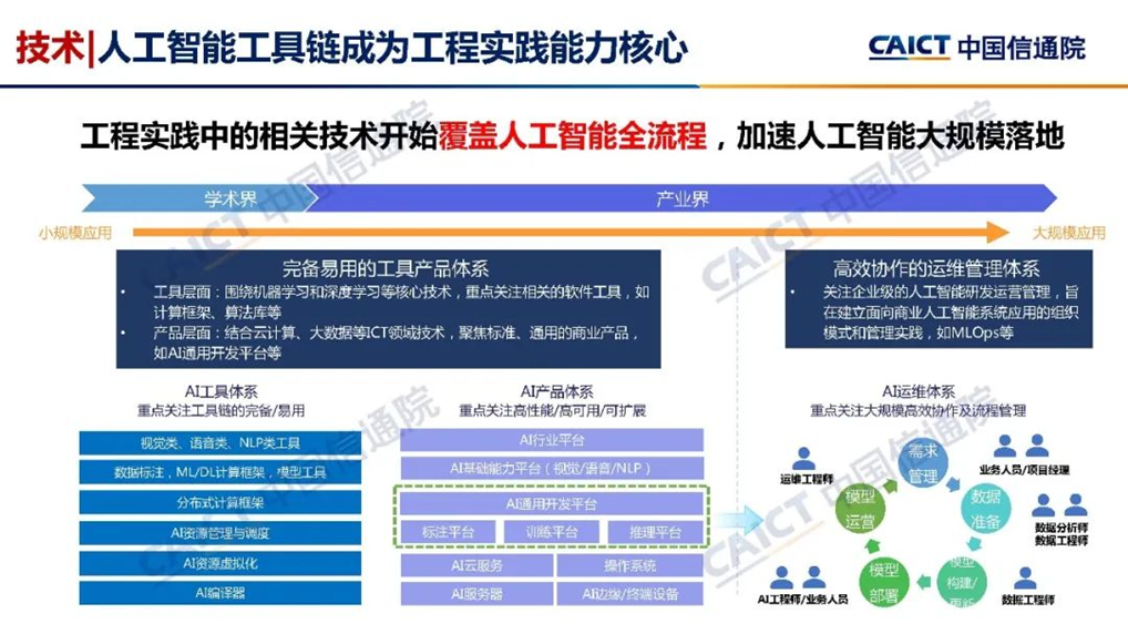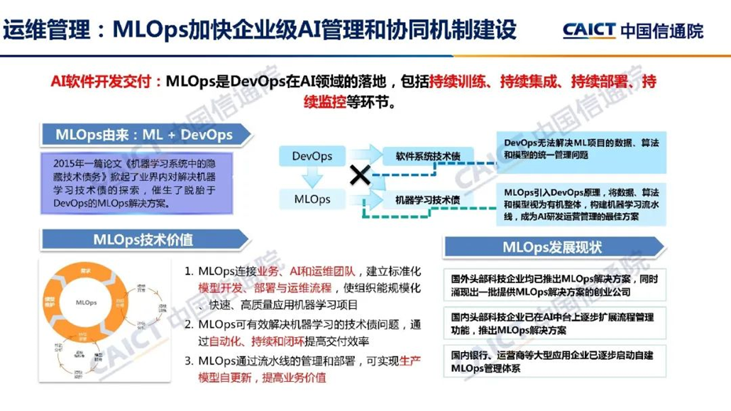 3、人工智能工程化聚焦工具體系、開發(fā)流程、模型管理全生命流程的高效耦合。工具體系層面,體系化與開放化成為研發(fā)平臺技術(shù)工具鏈的發(fā)展特點。開發(fā)流程層面,工程化關(guān)注人工智能模型開發(fā)的生命流程,追求高效且標(biāo)準(zhǔn)化的持續(xù)生產(chǎn)、持續(xù)交付和持續(xù)部署,最終以最佳的模型進(jìn)入應(yīng)用層面產(chǎn)生商業(yè)價值。模型管理層面,企業(yè)需要建設(shè)對模型生命周期的管理機制,對模型的版本歷程、性能表現(xiàn)、屬性、相關(guān)數(shù)據(jù)、衍生的模型檔案等進(jìn)行標(biāo)準(zhǔn)化的管理運維。