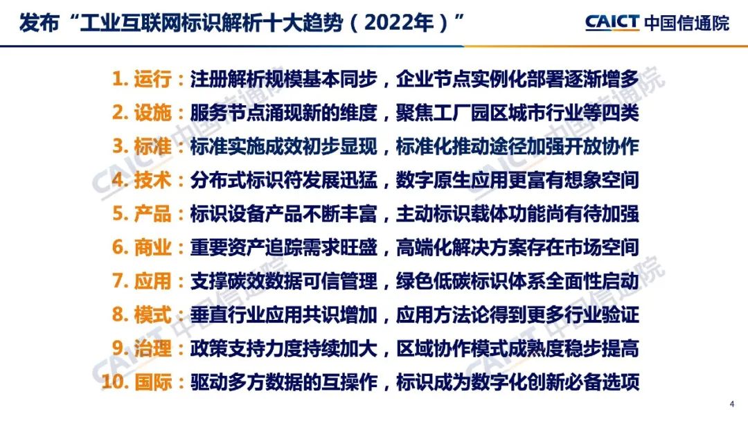 在2022年11月19日召開的2022中國(guó)5G+工業(yè)互聯(lián)網(wǎng)大會(huì)工業(yè)互聯(lián)網(wǎng)標(biāo)識(shí)論壇上,工業(yè)互聯(lián)網(wǎng)產(chǎn)業(yè)聯(lián)盟標(biāo)識(shí)工作組主席、中國(guó)信息通信研究院工業(yè)互聯(lián)網(wǎng)與物聯(lián)網(wǎng)研究所副總工程師劉陽(yáng)發(fā)布了工業(yè)互聯(lián)網(wǎng)標(biāo)識(shí)解析體系(2022年)十大發(fā)展趨勢(shì),該趨勢(shì)從運(yùn)行、設(shè)施、標(biāo)準(zhǔn)、技術(shù)、產(chǎn)品、商業(yè)、應(yīng)用、模式、治理、國(guó)際10個(gè)方向出發(fā),預(yù)測(cè)了未來幾年內(nèi)工業(yè)互聯(lián)網(wǎng)標(biāo)識(shí)解析發(fā)展的情況。