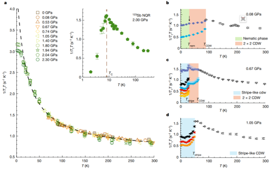 科研團(tuán)隊(duì)通過測(cè)量原子核的自旋-晶格弛豫率發(fā)現(xiàn),當(dāng)新的電荷密度波在壓力下被完全抑制后,體系在低溫下呈現(xiàn)出強(qiáng)烈的電荷漲落,表明籠目超導(dǎo)體具有顯著的電子關(guān)聯(lián)效應(yīng),這或是來源于籠目晶格中電子-電子之間非局域的相互作用(圖3)。此外,在壓力下的超導(dǎo)態(tài)與常壓下的超導(dǎo)態(tài)具有顯著不同的自旋-晶格弛豫率隨溫度的演化行為。傳統(tǒng)超導(dǎo)體通常會(huì)在超導(dǎo)轉(zhuǎn)變溫度之下表現(xiàn)出一個(gè)特征的Hebel-Slichter相干峰,而這一特征在之前籠目超導(dǎo)體常壓下的核磁共振研究中已被觀察到,表明常壓下的超導(dǎo)態(tài)是一種傳統(tǒng)超導(dǎo)態(tài)。然而,在壓力下的核磁共振研究表明,壓力下的超導(dǎo)態(tài)未表現(xiàn)出類似的Hebel-Slichter相干峰行為(圖3),這表明籠目超導(dǎo)體CsV3Sb5在壓力下的超導(dǎo)態(tài)可能是一種非常規(guī)的超導(dǎo)態(tài)。
