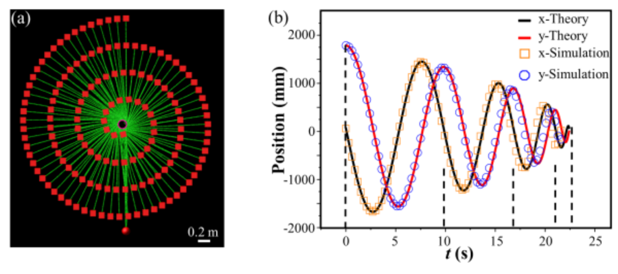 圖2.纏繞圈數(shù)n=4的模擬。(a)彈丸運動軌跡;(b)x、y方向的位移隨時間變化與理論的對比。
