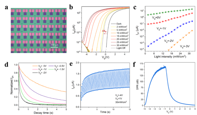 圖1 a)二維單層MoS2光電FET陣列;b)器件在不同輸入光功率下的轉(zhuǎn)移曲線;c)不同柵壓下光電流Iph與光照強度的依賴關(guān)系;d)不同柵壓下的歸一化光電流衰退曲線;e)器件非線性光響應(yīng)動態(tài)累積過程;f)不同柵壓下器件的動態(tài)響應(yīng)范圍(DPR)